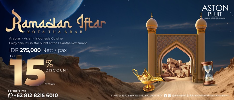 Wartabisnis.biz.id-Jakarta, Menyambut datangnya bulan suci Ramadhan, Aston Pluit dengan bangga mempersembah kan acara “Buka Bersama” yang istimewa dengan tema Kota Tua Arab. Acara ini diadakan untuk memberikan pengalaman kuliner yang mengesankan dengan hidangan berbuka puasa yang istimewa yang bisa dinikmati sepuasnya (all you can eat) serta di iringi dengan alunan musik Rohani sepanjang Weekend di Calantha Restaurant.