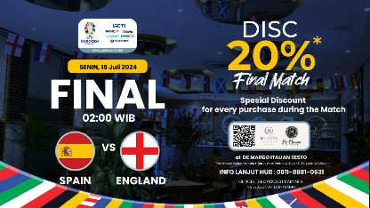 Jadi jangan lewatkan kesempa tan ini untuk merasakan seru nya nonton bareng Final EURO 2024 di De Margo Italian Resto, sayang untuk dilewatkan bukan? Segera reservasi seka rang, De Margo Italian Resto berlokasi di The Bellezza Per mata Hijau,