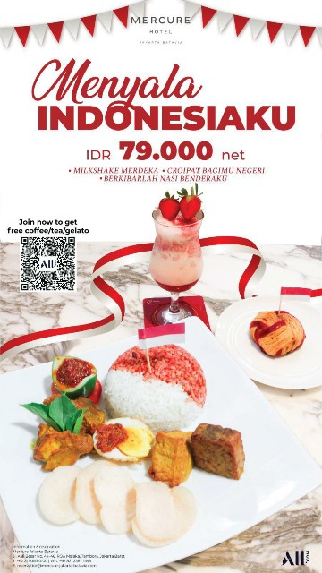 Bagi yang tidak menginap, ajak keluarga anda untuk menik mati cita rasa kuliner Indonesia dengan promo “Menyala Indo nesiaku” di Mercure Jakarta Batavia. Hanya dengan Rp 79,000 net tamu dapat menik mati hidangan khas yang terinspirasi dari semangat kemerdekaan yaitu Berkibarlah Nasi Benderaku, Milkshake Merdeka dan Croipat Bagimu Negeri.