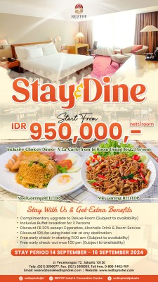 Wartabisnis.biz.id- Jakarta. REDTOP Hotel & Convention Center menghadirkan room promo “STAY AND DINE” dengan special rate Rp 950.000,- /nett /night, bisa dinikmati oleh semua kalangan yang ingin menghabiskan waktu akhir pekan bersama teman, kelu arga, pasangan ataupun dengan orang terkasih.