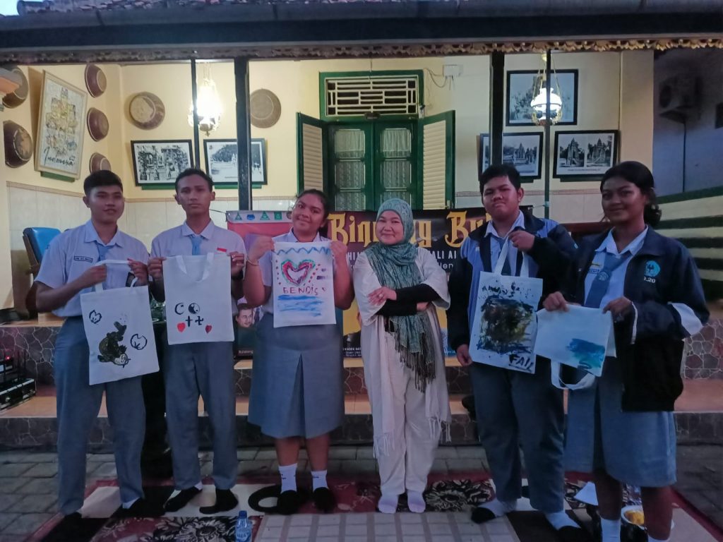 Setelah diskusi buku, para peserta diajak memvisuali sasikan makna agama cinta dengan melukiskannya di atas tote bag. Ada yang melukis lambang berbagai agama, pelangi dan cinta sebagai simbol keberagaman, jalan menuju kebenaran, hingga lukisan abstrak sebagai gambaran manusia yang katanya tidak bisa ditebak.