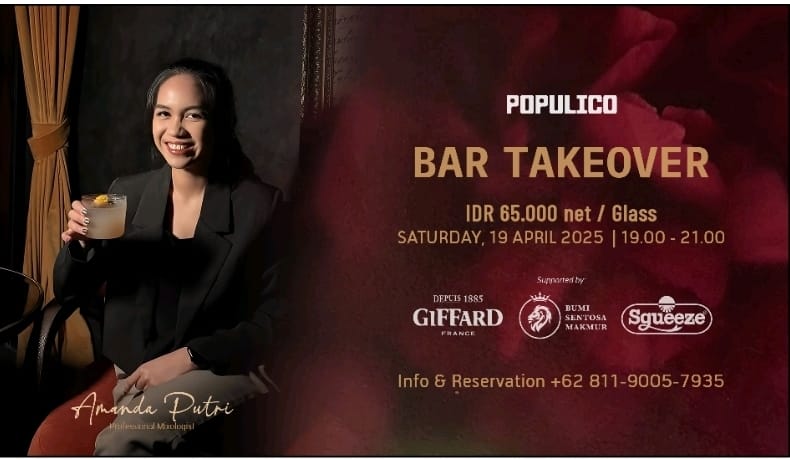 Populico American Restaurant di Alam Sutera menggelar serangkaian acara spesial untuk memeriahkan hari kartini Bar Takeover untuk pertama kalinya, berkolaborasi dengan salah satu profesional mixologist Amanda Putri dan didukung penuh oleh Giffard, Bumi Sentosa Makmur, Squeeze & BBC (Banten Beverage Community) yang diadakan tepat pada Sabtu 19 April 2025 di Populico Restaurant Hotel Tentrem Jakarta. Tak kalah menarik, Mixologist yang diundang sebagai kolaborator spesial pada bar takeover ini yaitu Amanda Putri sebagai bartendress di salah satu Bar di Jakarta, Amanda begitu sapaan nya juga menyajikan kreasi mocktail eksklusif Tamarind, Coffee, Caramel & Clove & Turmeric, Eucalyptus & Amaretto. Tamarind, Coffee, Caramel & Clove : Giffard caramel syrup, Squeeze tamarind & Cold Brew Turmeric, Eucalyptus & Amaretto : Turmeric Clarified & Eucalyptus menu yang disajikan di jual dengan harga Rp 65.000,-net/gelas.